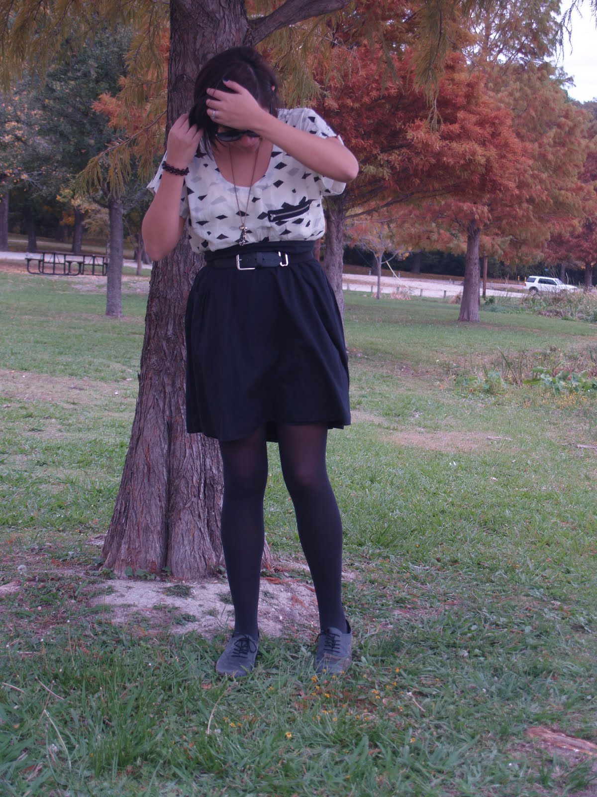 {Shirt: Plato's Closet, ($8.00), Skirt: Thrifted, ($1.59), Jacket: Target, (19.99), Shoes: Target, ($14.99), Tights: Target, ($5.00), Belt: Thrifted, ($1.99), Necklace: (same as 11/15), Sunglasses: (same as 11/15)}